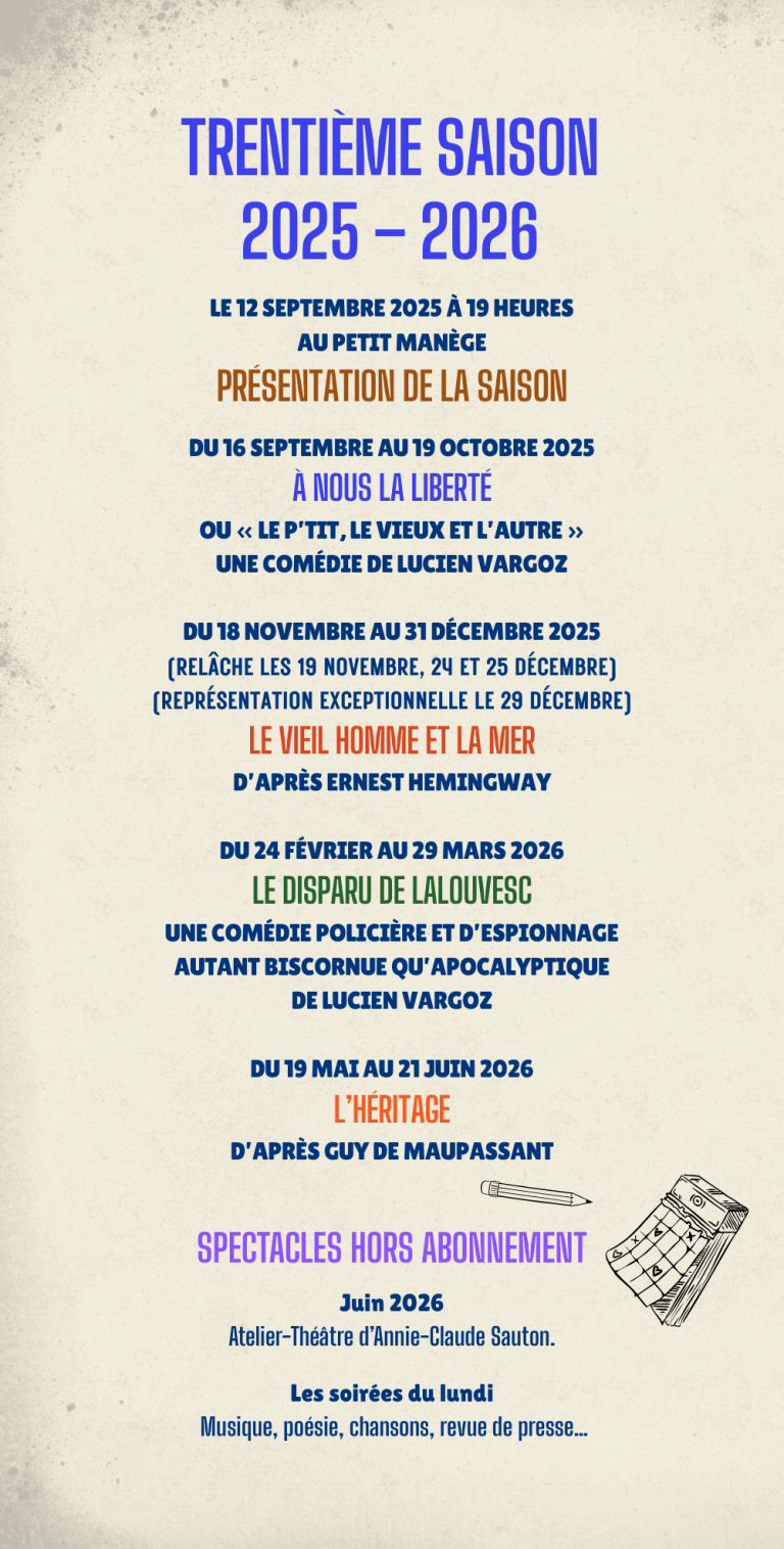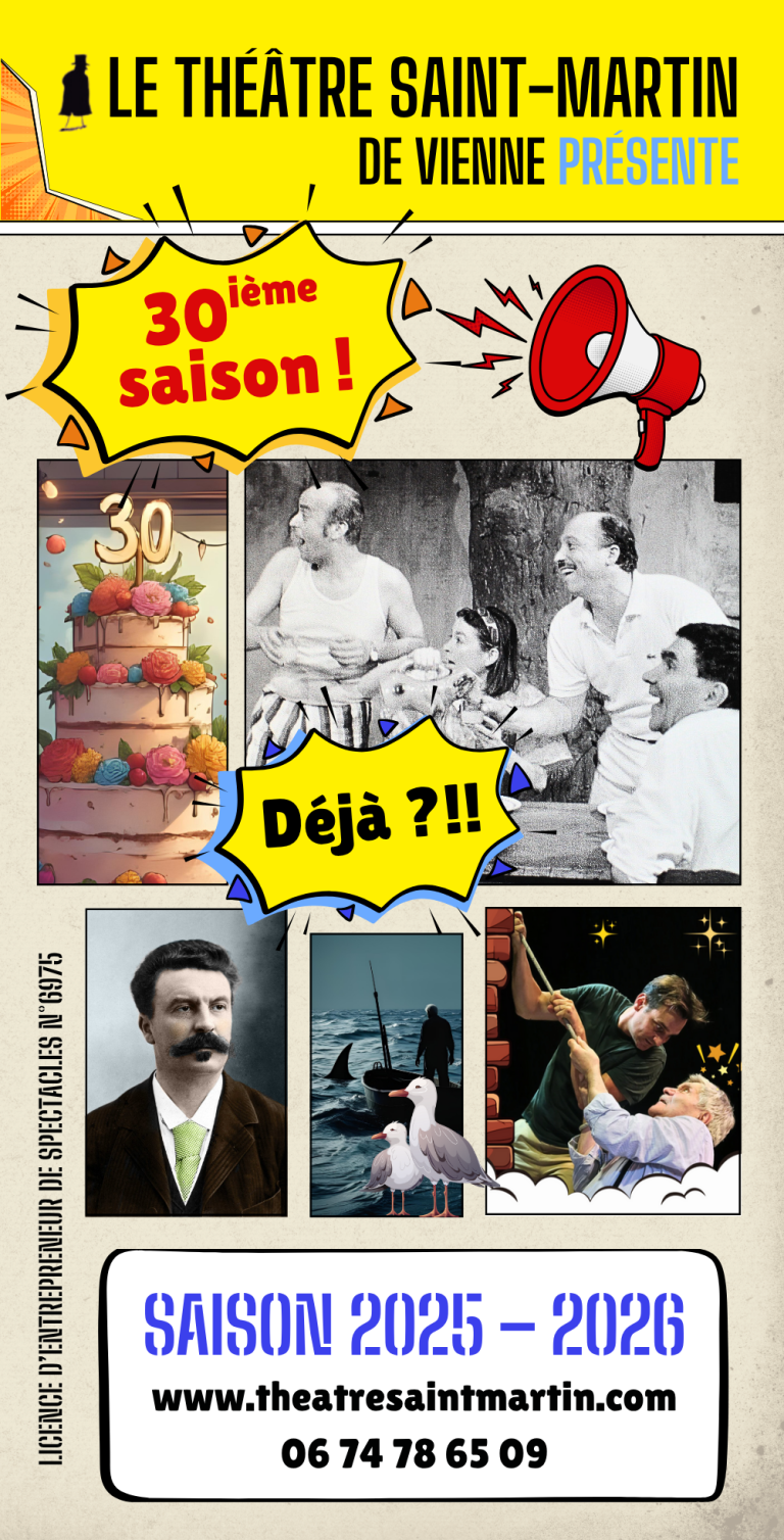 Le théâtre Saint-Martin de Vienne (38), ce sont 4 créations uniques par saison, avec de grandes distributions de comédiens professionnels. Pour chaque spectacle, nous vous accueillons pendant 5 semaines de représentations, du mardi au samedi à 20h30 et le dimanche à 16h au théâtre du Petit Manège à l'Espace Saint-Germain. Oui ! C'est au coeur de Vienne, devant un grand parking gratuit.
